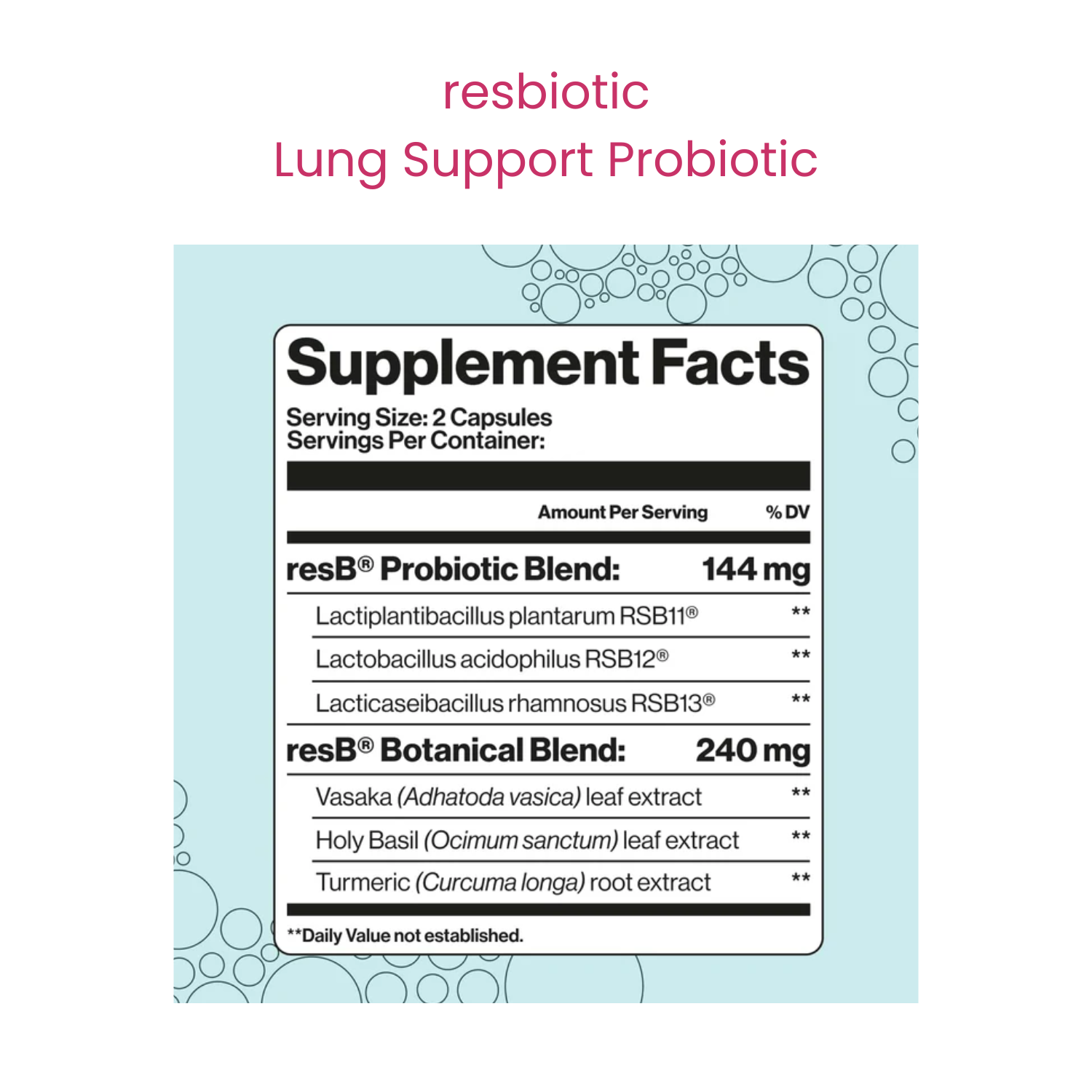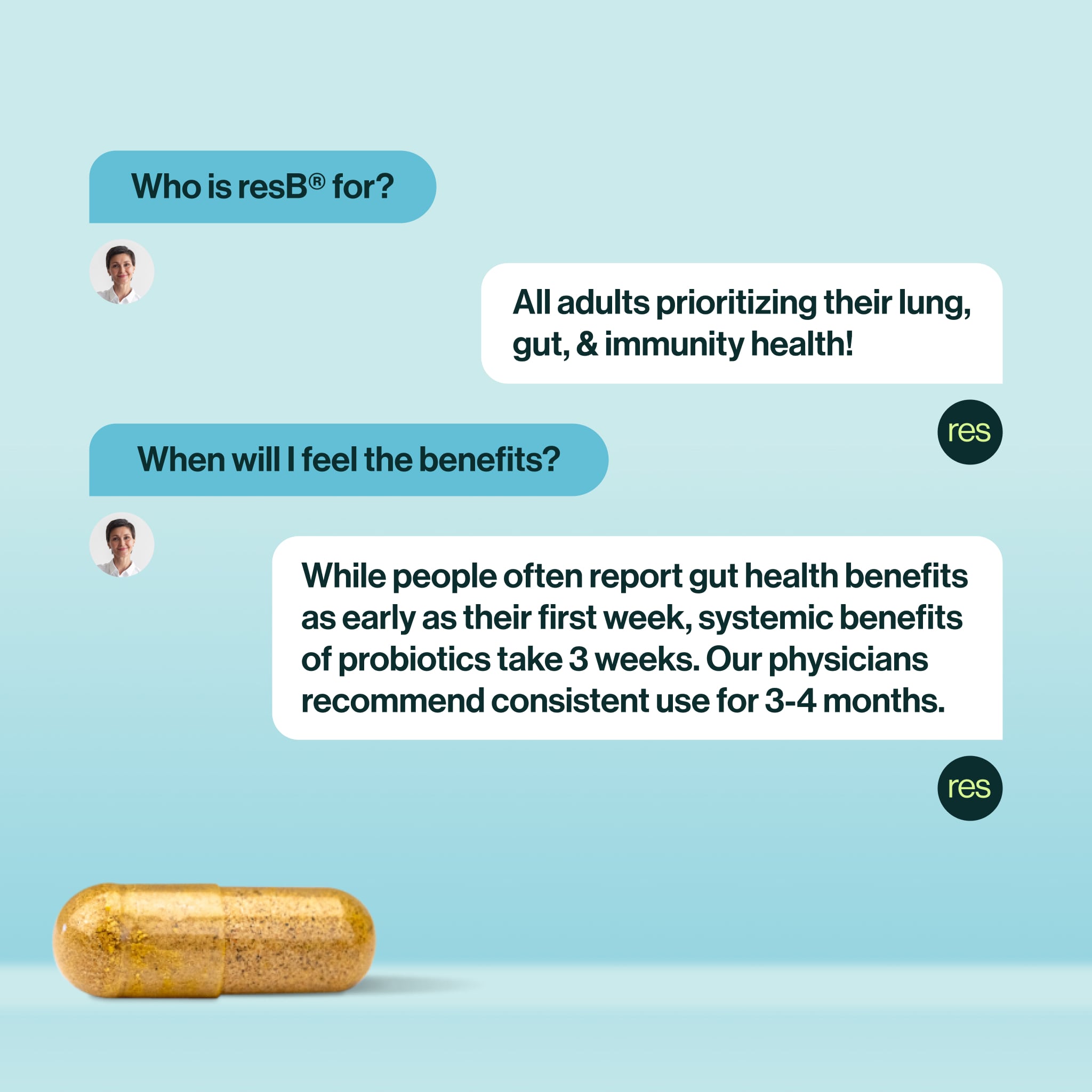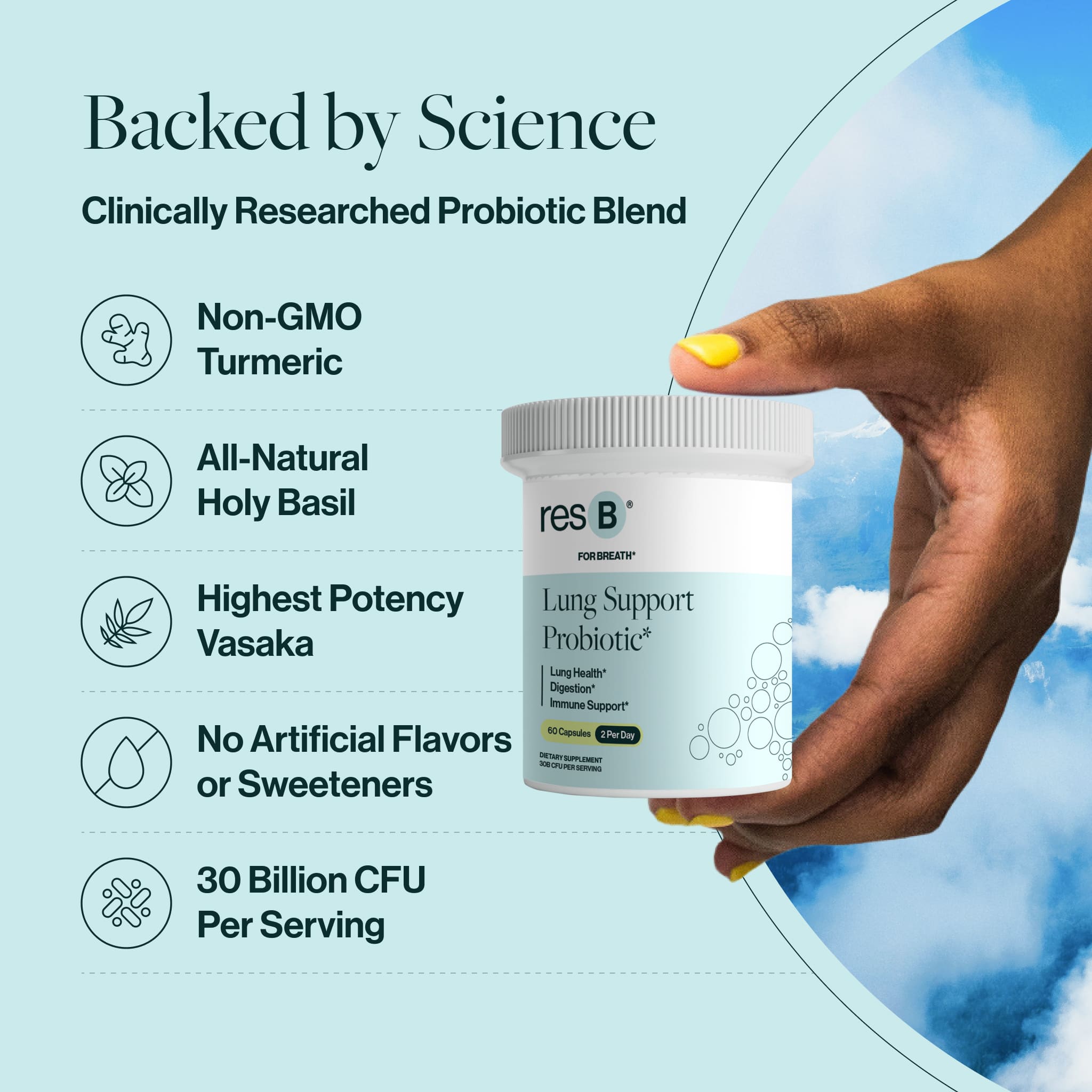resB® Lung Support Probiotic is the world's #1 clinically studied & pulmonologist formulated lung probiotic. Benefits Include: respiratory structure & function support, may clear mucus & minimize cough, seasonal sinus & bronchial support, improves gut & immune health, and better sleep due to better breathing.